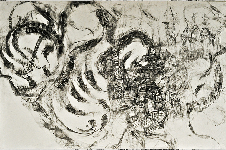 The process of creating the three 4 feet by 6 feet drawings involves concurrent mental and physical engagement. The drawing begins with broad strokes which parallel the major travelled routes, and progresses to increasing detail as memories of the city become more fluid. The various strokes which delineate spatial boundaries and trajectories of travel are created through drawing with charcoal, conte, and erasers of various textures and thicknesses.