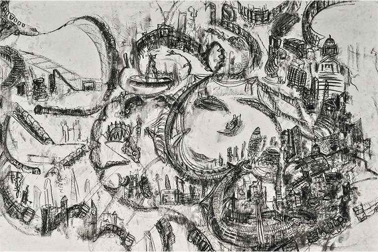 The process of creating the three 4 feet by 6 feet drawings involves concurrent mental and physical engagement. The drawing begins with broad strokes which parallel the major travelled routes, and progresses to increasing detail as memories of the city become more fluid. The various strokes which delineate spatial boundaries and trajectories of travel are created through drawing with charcoal, conte, and erasers of various textures and thicknesses.