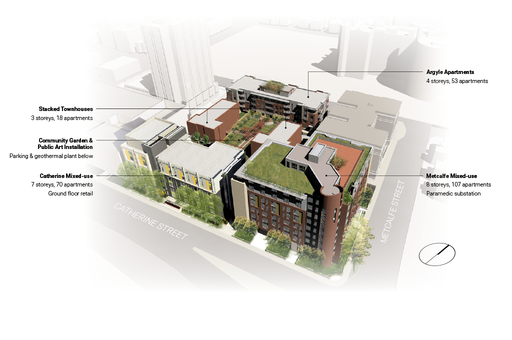Careful attention was paid throughout the process to ensure that the residential make-up of the development was reflective of the larger community. Apartments and townhouses are offered at market-value, geared-to-income, and subsidized rents.
