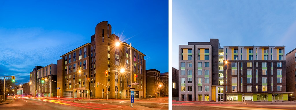 Located in the city’s urban core, steps away from the Canadian Museum of Nature, the Beaver Barracks Redevelopment is a large-scale urban redevelopment that transformed a long-vacant lot into a mixed-income housing community. Occupying half a city block, the project was carefully designed with its context in mind. The development is broken up into five distinct buildings, each with its own architectural character, but all working in unison to support each other and the neighbourhood. Height, mass, and details respond to the specific context of each block while working together to frame an outdoor room for a community garden at the centre. The tallest buildings are adjacent to the highway, creating an acoustic barrier to shelter community spaces within. The low four-storey buildings across from the museum reestablish the historical residential scale and rhythm of this downtown Ottawa street, all while allowing light to penetrate deep into the garden court and views out from the taller buildings beyond.